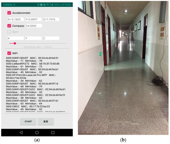 When the Wi-Fi mode was checked, the information of APs could be collected that included service set identifier (SSID), MAC addresses, the lowest RSSI value and the highest RSSI value. Figure 3b shows the actual environment of data collection. RSSI of each AP changes in real time and is not a constant value. For this reason, we collected the RSSI values and MAC addresses 30 times at every reference point of two floors. The sampling frequency was 10 Hz and the sampling time was 3 s. After that, all original information was saved to support the following work.