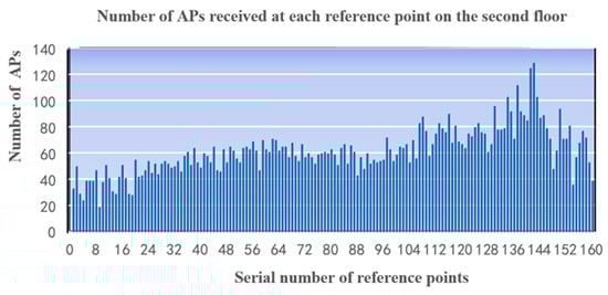Due to the large quantity of APs and reference points and the times of collection, the data of MAC addresses and RSSI values are huge [26]. It’s necessary to extract eigenvalues in order to establish the fingerprinting database [27]. In order to make efficient use of the collected AP (Access Point) information, AP optimization is required [28]. The reasonable selection of APs can not only improve the accuracy of positioning, but also reduce the computation time. As dozens of APs (the statistical results are 19–129, as shown in Figure 4) can be available to the receiver at each sampling point, the top 10 APs ranking by RSSI are selected to establish the fingerprinting database. Besides having the strongest signals, the top 10 APs must have long-term and stable availability.