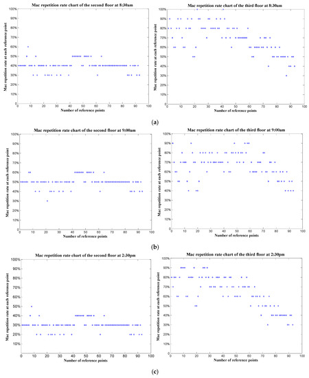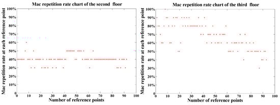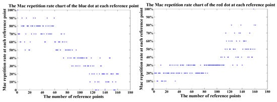 After that, the two points farthest from each other are selected as test points to calculate the MAC repetition rate between them and all reference points on the testing floor respectively. A comparison of MAC repetition rate between the two points is shown in Figure 8.