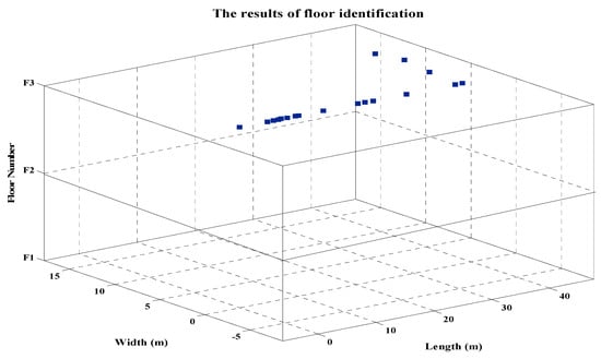 In order to verify the proposed method of indoor three-dimensional localization, an indoor three-dimensional positioning test was carried out. We collected the RSSI and MAC information of referenced points placed from the first floor to the third floor of the teaching building J6 of College of Geomatics of Shandong University of Science and Technology. The collected data were processed according to the method introduced in Section 3, and the fingerprint database was established. And then we tested the proposed algorithm for indoor three-dimensional localization. Figure 10 shows the floor identification results of the moving receiver. As shown in Figure 10, the proposed method of floor identification based on MAC repetition rate can accurately identify the floor where the moving receiver is located (the height of each floor is 3 m).