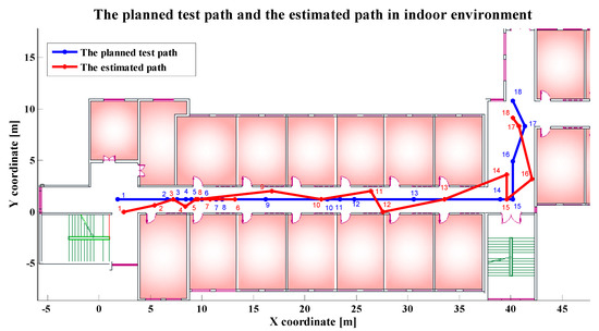 In order to get the accurate position of the moving receiver within the single floor, we used the two-step method to locate the moving receiver. Here, we sampled 18 test points along the central line of the corridor. These test points were selected in the sites where the location characteristics were more obvious, for example, the corners of floor tiles, the points aligned with the edge of the door. Half of them were densely placed at a shorter distance and half were scattered at a longer distance to make test points have a more reasonable distribution. Figure 11 shows the comparison of the planned test path and the real-time estimated path on the same floor. The blue one is the planned test path. The red is the real-time estimated path of the moving receiver. It can be seen that the orientation of the estimated path is consistent with the orientation of the test path. Table 2 shows that the average of localization errors between planned test points and real-time estimated points is 1.8 m, with a minimum of 0.4 m.