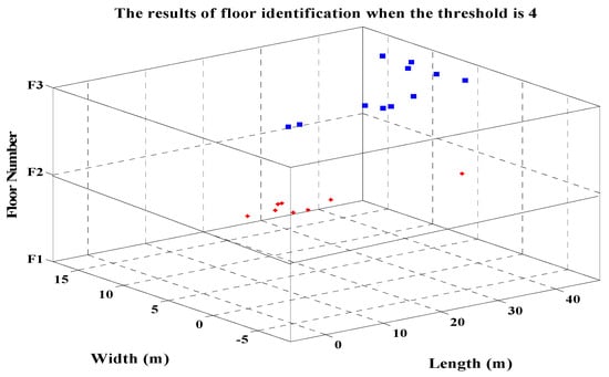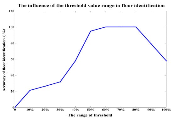 When identifying the floor based on MAC repetition rate, the threshold of MAC repetition rate is crucial for the correct identification, with the range of 1 to the dimension of the MAC vector in the database. In order to study the impact of the threshold on floor identification’s accuracy, we let the dimension of the MAC vector be 10 and tested the variation of the floor identification accuracy with the threshold range of [10%, 100%]. We can see from Figure 12 that the accuracy of floor identification can be 100% correct when the threshold is 60%, 70% or 80%. The floor identification rate decreases when the threshold is other values, which makes some test points be identified to wrong floors. As shown in Figure 13, 11 of 19 test points located on the third floor are judged to be on the third floor while the rest to be on the second floor when the threshold is 40%. Therefore, on the stage of floor determination by using the MAC repetition rate, the threshold should be between 60%–80% to ensure the right floor identification completely.