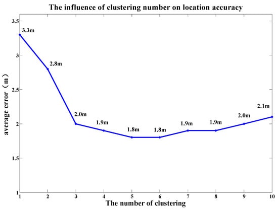 In order to find whether the clustering number of coarse positioning has an impact on final positioning accuracy, we implemented a test with different clustering numbers with the range of values between 1–10. The test results are shown in Figure 14. When the clustering number is 1, the average position error is 3.3 m. With the increase of the clustering number, the average positioning accuracy improves significantly. When the number of clusters is 5, the positioning error is up to the lowest value of 1.8 m. However, when the number of clusters increases again, the positioning errors begin to increase and the positioning accuracy becomes worse. This is because the reference points near the boundary between two adjacent sub-regions may be clustered into the wrong sub-region.