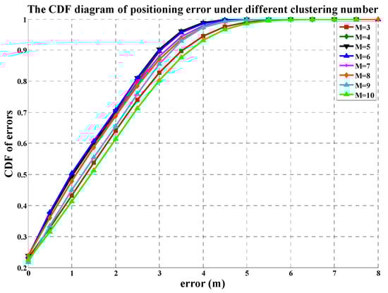 Figure 15 shows the CDF (Cumulative Distribution Function) diagram of errors when the clustering number is in the range of [3,10]. In the DCF chart, denotes the clustering number. The more the curve approaches to the upper left, the higher the accuracy of the curve is, on the contrary, the lower right curve has the worst positioning accuracy. When 4, 5 and 6, the CDF curves of them almost overlap each other. Their probability of location error within 3 m is up to 90% and that within 2 m is up to 70%. When M value is 10, its CDF curve is far away from others, and its probability of location error is only 61% within 2 m. This indicates that the positioning accuracy does not always improve along with the increase of the number of clustering. In addition, theoretically, the increase of the clustering number will increase the complexity of position matching. Therefore, we proposed that the most suitable clustering number is 5 when positioning in real indoor environment.