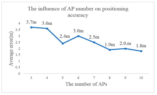 The first factor to consider in determining the number of APs () is the number of APs acceptable to each location point in the location scene, which is affected by the density of AP layout. Only when there are more APs available, can we adopt more APs to locate the receiver. However, according to the principle of the fingerprint localization algorithm, the increase of AP number will increase the storage space requirement of the fingerprint database and reduce the computing efficiency of localization algorithm. In our test area, the receiver at each reference point could access 19 to 129 APs, so we choose the top 10 APs in signal intensity. Based on our established fingerprint database, we tested the number of APs and positioning accuracy, and found that reducing the number of APs will reduce the positioning accuracy as shown in Figure 16. Because our testing fingerprint database only stored 10 of the strongest APs at each reference point, it was given that the change of positioning accuracy when the number of APs varies only from 3 to 10.