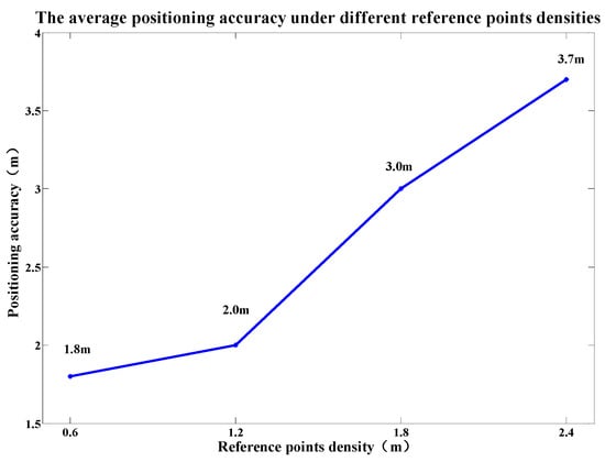 In order to explore the relation between the positioning accuracy and the density of reference points, we laid out a test court in the open area of the first floor of the teaching building J14 with the reference point density of 0.6 m, and then fingerprinting databases of 1.2 m, 1.8 m and 2.4 m were obtained by resampling that of 0.6 m. Figure 17 shows the average positioning accuracy under different reference point densities. When the reference point density is 2.4 m, the positioning error reaches 3.7 m. When the reference point density increases to 1.2 m, the positioning accuracy is greatly improved, with the positioning error of 2.1 m. When the reference point density is 0.6 m, the positioning accuracy is slightly improved, with the positioning error of 1.8 m.