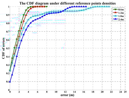Figure 18 shows the CDF diagram of the positioning error under different reference points densities. When the reference point density is 2.4 m, the CDF curve is at the bottom and only 50% of the positioning errors are within 2 m. When the reference point density reaches 0.6 m, the CDF curve is located at the top with 71% of the positioning error within 2 m, and the ratio of the positioning error within 3 m is up to 90%. In addition, we can observe that although the reference point density has a positive association with the positioning accuracy, its impact on the positioning accuracy will be unobvious when the reference point density is high to a certain extent. In terms of efficiency, the increase of the reference point density will make the establishment of the fingerprint database complex, so it is the most appropriate choice to set the reference point density as about 1 m.