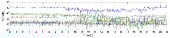 In order to test the MAC repetition rate for the same point during different periods of day, we have collected RSSIs and MAC addresses of APs at one-minute intervals, totaling 1440 sets of data. Firstly, let’s see the changes in RSSI over a day shown in Figure 19. From the figure, we can draw some conclusions: (1) The RSSIs of all APs fluctuate greatly from 8:00 am to 23:00 pm while the other time periods are relatively stable for the period from 8:00 am to 23:00 pm is working time and RSSIs are affected greatly by the human activities; (2) The weaker the signal of AP is, the more greatly its RSSI fluctuates, which is related to the path length between the AP and the receiver; (3) The signal intensity of the top 4 APs differ greatly, while the average signal intensity differences of the latter six APs become smaller.