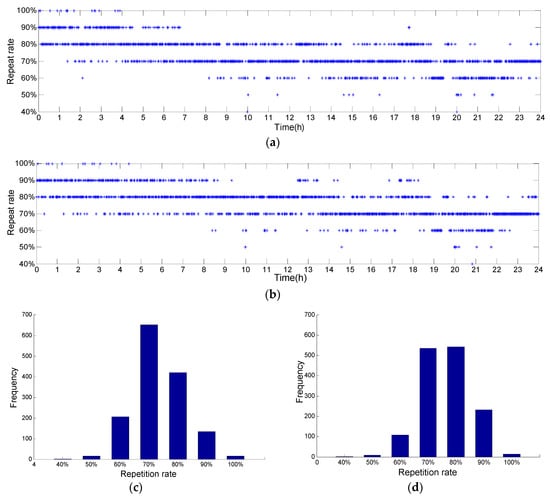 The changes of the MAC repetition rate in a day: (a) the datum is at the beginning of 0:00 am; (b) the datum is at the beginning of 12:00 am; (c) the histogram of the MAC repetition rate of (a); (d) the histogram of the MAC repetition rate of (b).
