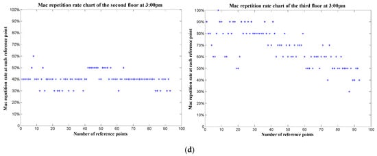 One is the change of the MAC repetition rate for the same reference point in a day. The mode of the MAC addresses in an hour at the beginning of 0:00 am is taken as datum. The datum vector is composed of MAC addresses of the top 10 APs with the largest occurrence. The change of the MAC repetition rate in a day is as shown in Figure 20a. In addition, to examine the impact of datum selection on results, we also take the mode of the MAC addresses in an hour at the beginning of 12:00 am as datum, and the change of the MAC repetition rate is as shown in Figure 20b. Figure 20c,d shows that the majority of the MAC repetition rates are between 60% and 90%.
