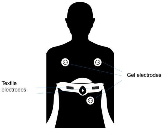 The ECG-belt used in this study was previously described by Weder et al. [5]. Placement of the ECG-belt and the gel electrodes are shown in Figure 1. The ECG-belt consists of a semi-elastic polyester belt (Unico Swiss Tex GmbH, Alpnachstad, Switzerland) with directly embroidered Ag/Ti-coated PET yarn (Serge Ferrari Tersuisse AG, Emmenbrücke, Switzerland), forming the electrodes. These electrodes exhibit a low electrical resistance of typically <1 kΩ, provide good skin contact (textile belt and flexible, embroidered electrodes based on PET fibers coated by approx. 100 nm Ag and approx. 4–7 nm Titanium), are supposed to overcome skin irritations associated with gluing, and due to moistening, enable good signal quality also on dry skin and at rest. The two 20 × 70 mm electrodes are incorporated into a textile “wearable” belt with stretchable parts and trimmed to adjust the size. The wearable includes a wetting system (small water tank incorporated in the area between the electrodes connected to pads matching the size of the electrodes with a high water vapor permeable membrane towards the electrodes), which delivers approximately 1 to 2 g of water per day.