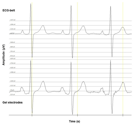 A representative sample of ECG waveforms for gel electrodes and the ECG-belt.