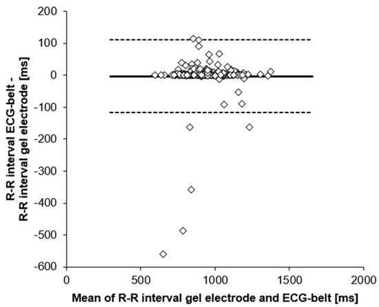 Signal quality was assessed by means of high- and low-frequency SNR and baseline wander (Table 2). Particularly, the low-frequency SNR and baseline wander are critical parameters to be considered as they affect R-peak detection. Even though statistically significant differences were detected between signal quality for gel electrodes and ECG-belt, no significant effect was found for R-peak detection and the respective calculation of RR-intervals (Table 3). Furthermore, evidence for the high validity of RR-interval measurements using the ECG-belt comes from our observation that mean values of the ECG-belt measurements only differed by 0.39% from respective reference values (gel electrodes) and that the standard deviations were similar between the two methods (Table 3). In addition, high validity is indicated by a low root mean square as well as a low standard error of the estimate. Furthermore, Pearson r for comparisons between the ECG-belt and the gold standard was in a similar range as for comparisons of other wearable devices and gel electrodes ([20]; Table 3). Corroborating these data, regression analysis with a high coefficient of determination showed high validity of the RR-interval measurements using the ECG-belt (Figure 3). Finally, the high validity of the measurements using the ECG-belt is confirmed by the Bland-Altman plot with narrow 95% confidence intervals (upper CI 111 ms, lower CI −117 ms). In particular, Bland-Altman analysis indicates a small fluctuation range of differences as well as no trend to a systematic over- or underestimation of values assessed by the ECG-belt. However, in our Bland-Altman plot, six outliers were apparent, all of them revealed large differences in artefact values between the ECG-belt and the gel electrodes. Our findings are in line with the results of Georgiou et al. [20], who reported in his meta-analysis several studies with similar correlation coefficients for ECG measurements using gel electrodes and portable ECG devices. In addition, high values in SNR for high frequency for both systems confirmed high signal quality, even though a statistically significant difference was observed between gel electrodes and ECG-belt.