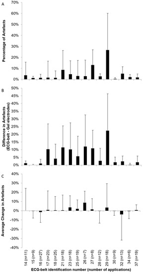 Data about artefacts observed for individual ECG-belt and number of use (n). (A) The median and interquartile range of artefacts observed for individual ECG-belts. (B) Average difference (standard deviation) in artefacts between ECG-belt and gel electrodes and standard deviation to emphasize ECG-belt associated artefacts. (C) The average change in artefacts (standard deviation) for consecutive applications of individual ECG-belts.