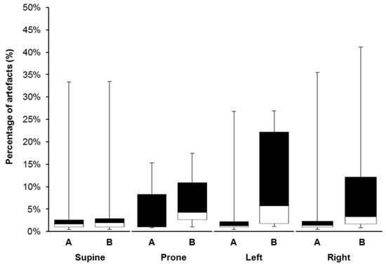 Influence of body position on the occurrence of artefacts for RR-interval measurements using gel electrodes and the ECG-belt. The influence of body position (supine, prone, left body side, right body side) on measurement quality is presented. Data relate to 13 or fewer applications of a belt. A, gel electrodes; B, ECG-belt. Supine, patient lying on the back; prone, patient lying on the chest; left and right, patient lying laterally Black part of boxes indicates upper quartile; white part of boxes indicates the lower quartile. Whiskers represent data for maximal values.
