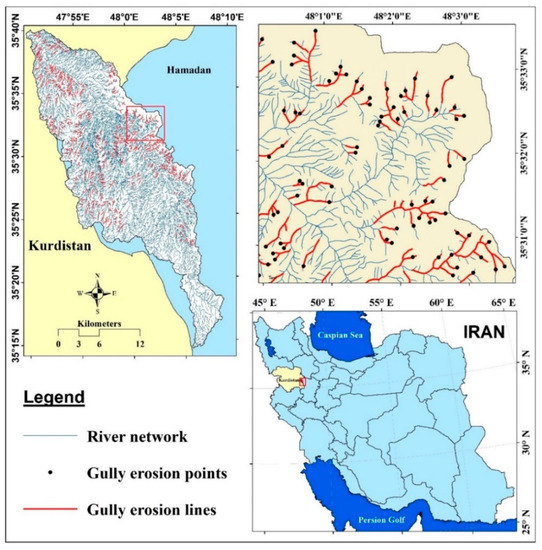 Location of study area and gully erosion sites in Kurdistan province and Iran.