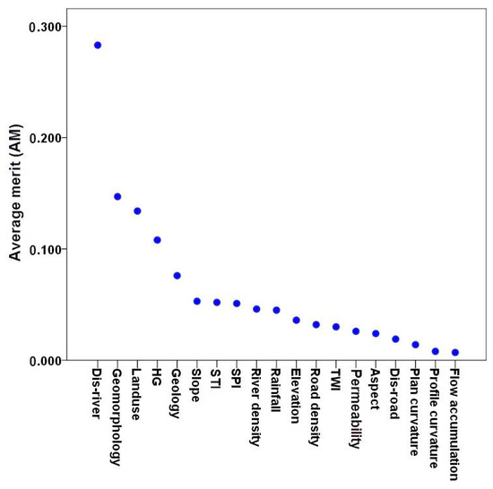 The predictive average merit of gully erosion affecting factors by the IGR method is shown in Figure 4. Factor selection results showed that 19 out of 22 conditioning factors were capable of modeling gully erosion prediction (AM > 0). Distance to river has the highest average merit for gully modeling (AM = 0.283). It is because most gullies in the study area were located beside the river networks. It is followed by geomorphology (AM = 0.147), land use (AM = 0.134), HG (AM = 0.134), lithology (AM = 0.076), slope (AM = 0.053), STI (AM = 0.052), SPI (AM = 0.051), river density (AM = 0.046), rainfall (AM = 0.045), elevation (AM = 0.036), road density (AM = 0.032), TWI (AM = 0.03), permeability (AM = 0.026), aspect (AM = 0.024), distance to road (AM = 0.019), profile curvature (AM = 0.008) and flow accumulation (AM = 0.007).