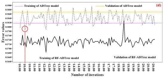 In the modeling process, the determination of optimum parameters values in all algorithms is a critical issue for achieving an algorithm with the highest goodness-of-fit and performance. The optimum parameters of the investigated models are shown in Table 2. Basically, the new hybrid RF-ADTree and soft computing benchmark models (NBMU, SVM-Polynomial, SVM-RBF, and LR) were built using 19 conditioning factors and training dataset for the spatial prediction of gullies. In this study, the optimum number of seed (from 1 to 10) and iteration (from 10 to 20 iterations) was obtained with various numbers of iterations and seeds versus AUC and RMSE for the training and validation of datasets under a trial and error procedure.