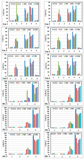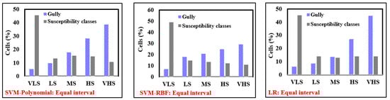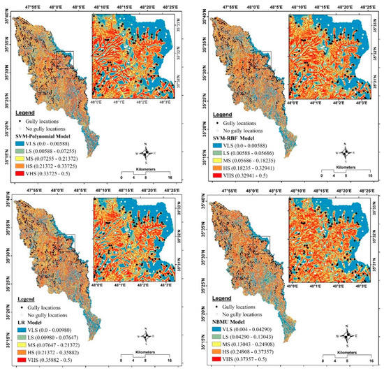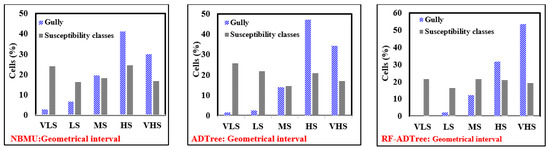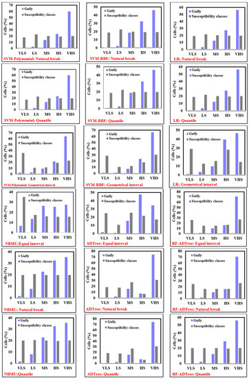 As above-mentioned, the GESI for each cell converted into raster format and gully erosion susceptibility maps were prepared and they were classified. Generally, the histograms of all models for different classification methods indicated that the majority of the observed gullies are located in VHS class (Figure 6). According to the susceptibility map of the RF-ADTree model, the very high susceptibility class determined by equal interval, natural breaks, quantile and geometrical interval methods cover 26.9%, 26.4%, 20.2% and 19.5% of the whole watershed cells and, 71.4%, 70.6%, 56.1% and 53.4% of the observed gully cells, respectively. Therefore, for the RF-ADTree model, the equal interval method was selected as the most appropriate method for classification of gully erosion susceptibility. Accordingly, the geometrical interval method was selected for SVM-Polynomial kernel and SVM-RBF kernel susceptibility maps, and the natural break method was the appropriate classification method for the LR, the NBMU and the ADTree susceptibility maps. The gully erosion susceptibility maps generated by the developed models are shown in Figure 7.