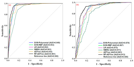 The results of statistical performance analysis of models by the training dataset are shown in Table 3. These results indicate that all of the models have shown good performance for gully erosion in the training stage. In terms of sensitivity, the results stated that the new proposed model, RF-ADTree, has the highest sensitivity (0.877), indicating that 87.7% of gully erosions are correctly classified as gully erosion. It is followed by SVM-Polynomial kernel (0.875), SVM-RBF kernel (0.858), ADTree (0.842), LR (0.739) and the NBMU (0.768) models. Similarly, the values of specificity concluded that the new proposed model showed the highest value (0.804), followed by SVM-RBF kernel (0.793), ADTree (0.771), LR (0.764), SVM-Polynomial kernel (0.762) and the NBMU (0.747) models. The accuracy values indicated that the RF-ADTree model also has the highest value (0.837), followed by the SVM-RBF kernel (0.822), SVM-Polynomial kernel (0.809), ADTree (0.802), LR (0.797) and the NBMU (0.765) models. Additionally, the RF-ADTree hybrid model obtained the least RMSE value (0.373) in the training dataset, followed by the SVM-RBF kernel (0.375), LR (0.376), SVM-Polynomial kernel (0.378), ADTree (0.379) and the NBMU (0.398) models. Moreover, it can be observed that the RF-ADTree model has the highest AUC value (0.909), followed by the SVM-RBF kernel model (0.895), the ADTree (0.885), the LR model (0.876), the SVM-Polynomial kernel (0.871) and the NBMU model (0.844).