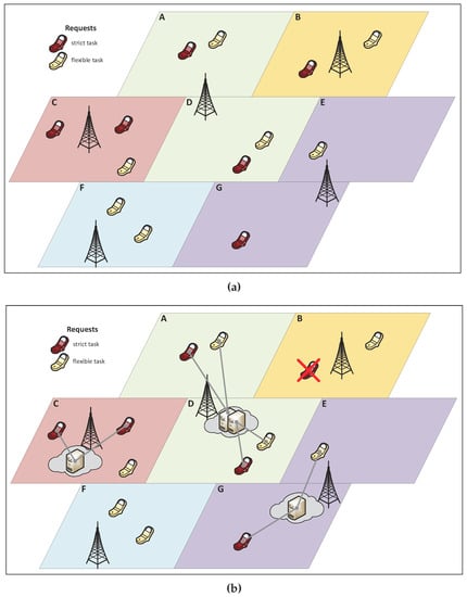 The system considered in this paper assumes that both strict and flexible workloads vary over time. Without loss of generality, a discrete-time model has been adopted. Figure 1a illustrates the node location problem. This figure presents a segment of a city, divided into seven areas, identified by letters A–G, with end users served by five base stations (BS). Regions A and D are served by the same BS, another BS processes the requests made in Regions E and G, and the remaining regions are each served by an individual BS. A cellphone represents a request and the color associated with it identifies the type of request (strict or flexible). BSs are considered to be possible locations for hosting a fog node. Suppose that the provider can employ up to four servers, and each server can host two requests at the same time. One possible solution for this scenario is shown in Figure 1b. Three fog nodes have been created, one with two servers in the BS in Region D, and two nodes with a single server in Regions C and G. The fog node in D can serve both strict and flexible requests in its coverage area. The fog node in C serves strict requests in its area, as well as a flexible request, which could not be served using the cloud resources. In Region B, strict requests are blocked, since no fog node is available.