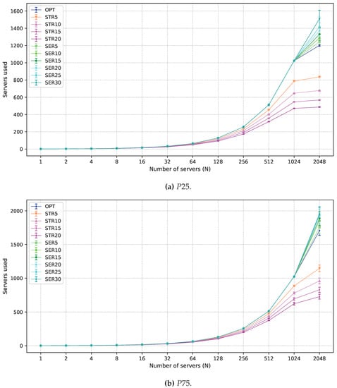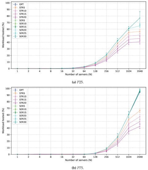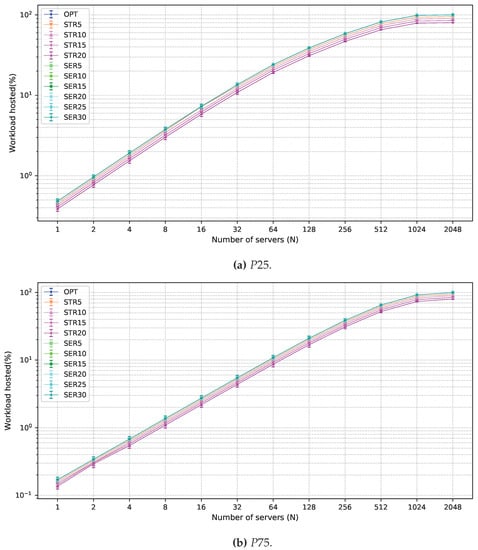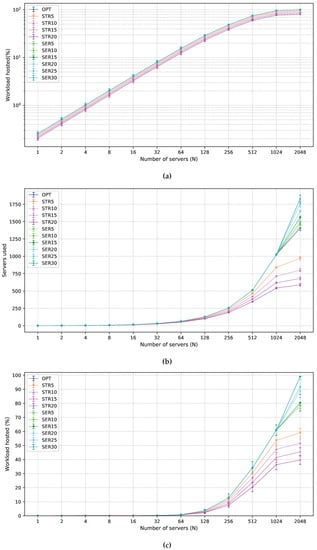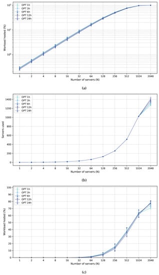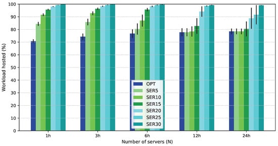 results are discussed for the scenario in Figure 3. The larger is the number of available servers, the larger is the number of servers utilized (Figure 3b). This is a result of the main goal of the solution to serve the maximum number of strict workloads possible, which leads to more servers being used in the solution. For , the available servers cannot cope with the entire strict latency workload since most of the available servers (N servers) are used. This causes the overlap of the curves for all planning intervals. For , the available capacity is greater than the total demand, so the entire demand is met (Figure 3a), requiring between 1480 and 1710 servers. The number of required servers varies according to the planning interval: short planning intervals may not contain periods during which a location is crowded. Consequently, for longer intervals, a large number of periods of peak demand is present for several locations, which requires the deployment of a larger number of servers. Results for are the same as those for since the multi-level programming approach optimizes the entire served demand in Equation (1); hence a larger number of servers does not lead to any improvement in the strict latency workload service.