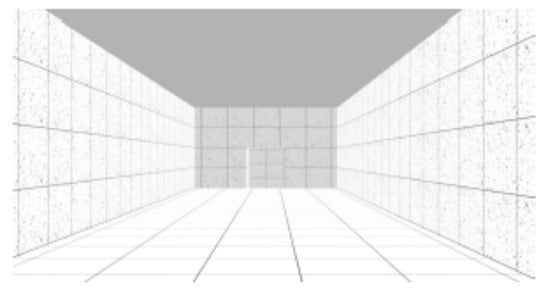 It was decided to use a grey concrete texture for all walls that included a rectangular frame simulating the concrete formwork. All floors were grey in color as well and had a square pattern simulating floor tiles. Lighting was done by five light points across the whole sequence of spaces, with the same attenuation factor (linear/quadratic = 0) and falloff distance (25 m).