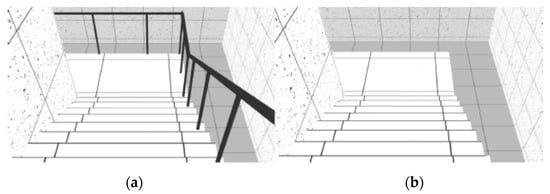Two geometrically identical virtual models were designed with a difference - established by the presence or absence of handrails in stairs and ramps. The virtual model with handrails was considered a safe environment (left side of Figure 2, Figure 3, Figure 4 and Figure 5) and the one without handrails was considered an unsafe environment (right side of Figure 2, Figure 3, Figure 4 and Figure 5).