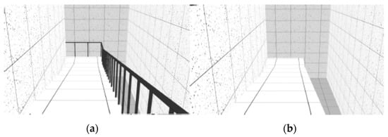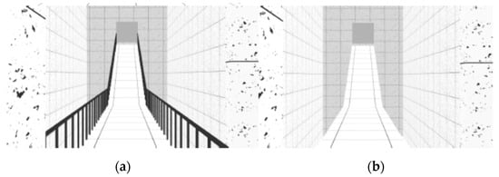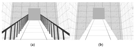 The VE was composed of sequenced spaces, like rooms, stairs and ramps, which simulated the interior of a building. As reported in previous studies [], three neutral rooms were designed with 30 m long by 5.5 m wide (Figure 1). These neutral rooms interchanged with non-neutral spaces, like stairs and ramps. Stairs and ramps were designed according to standard construction regulations. The VE was composed of two flights of descending stairs with 12 steps each (0.28 × 0.18 m) and 1.5 m wide (Figure 2); two flights of descending ramps with 10 m long by 1.5 m wide and 20% slope (Figure 3); one horizontal plane with 1.5 m wide by 10 m long followed by an ascending ramp with the same dimensions and with 40% slope (Figure 4).
