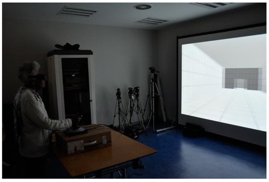 For the Pocket CAVE (Figure 6) the virtual model was projected on a 4 m × 3 m screen by a stereoscopic Digital Light Processing (DLP) projector (DepthQ HDs3D-1, Bellevue, WA, US) with 1280 by 720 pixel resolution, and visualized with active glasses (nVIDIA® 3DVision(TM)2, Santa Clara, CA, US). The observation distance (i.e. the distance between the observers’ eyes and the screen) was 3.50 m. The virtual camera had 45° of horizontal Field of View (FOV) and 33° of vertical FOV, approximately. Participants navigated in the VE in a fixed path and used a joystick (Logitech Extreme 3D Pro, Lausanne, Switzerland) with a constant displacement speed of 0.82 m/s [] for moving forward or to stop. We used the CAVE Hollowspace software system [] fully developed and maintained in-house by our research team.