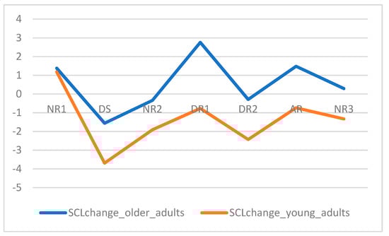 We proceeded to test a secondary manipulation of safety that was introduced afterwards concerning the sequence of neutral and non-neutral spaces. We found the differences in arousal interesting, along with the navigation in the VE, with differentiated patterns for both SCL change and HR change. For SCL change, we found an initial peak in Neutral Room 1. Although we were not expecting to detect arousal in a neutral room, this result is in line with previous studies showing that SCL is affected by the novelty effect []; this was verified even though we included a training phase that lasted until the subject reported being accommodated to the task. Furthermore, we also conclude that the SCL recordings captured modulations, along with the spaces (a space or event effect), if we consider the fact that SCL is a slow-moving parameter that resulted in delayed peaks—SCL change positive peaks usually occurred in the space adjacent to the space that must have elicited the arousal. Latencies of SCL change are assumed to be in the range of 1 or 2 s []. For HR change, although it initiated as expected, reaching the first peak in Descending Stairs, it subsequently decreased, along with navigation in the remaining spaces, whether neutral or non-neutral. We assume that the habituation effect possibly impacted on HR which leads us to conclude that SCL change might be a more sensitive physiological measure for the purpose defined herein. In line with previous findings, SCL change captured the novelty and space (or event) effects [,]. Although the validity and sensitivity of these measures were not clear enough in terms of reliability, our third hypothesis was confirmed, showing that both measures are reliable and allow for/provide/ express/produce a positive correlation across experiments irrespectively of the presence and absence of handrails, and irrespectively of age differences.