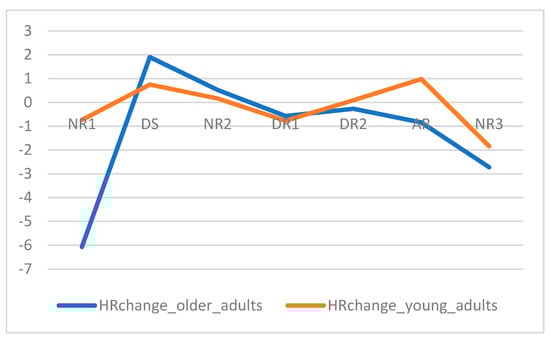 We proceeded to test the interaction effects between the sample and both the handrails (safe vs. unsafe conditions) and space effect. For SCL change, crossing the sample with the handrails effect, we obtained that for the safe condition (U = 19.00) in Descending Ramp 1, older people displayed higher activation (mean = 4.05; SD = 4.36) than young adults (mean = −1.50; SD = 5.09). For the unsafe condition, no differences were found between groups. For HR change, we found an interaction effect for the unsafe condition for Descending Ramp 1 also (U = 19.00), with older adults showing further decreased activation (mean = −3.09; SD = 4.64) than young adults (mean = 0.93; SD = 2.20), which again was not expected. When considering each sample separately, we still did not find any differences between the presence and absence or handrails. We proceeded to evaluate the space effect for each sample separately. Statistically significant differences in the modulation of HR physiological activity throughout the spaces of the VE were majorly found for older adults (Table 8), this modulation showing the pattern previously found for the space effect irrespectively of the samples.