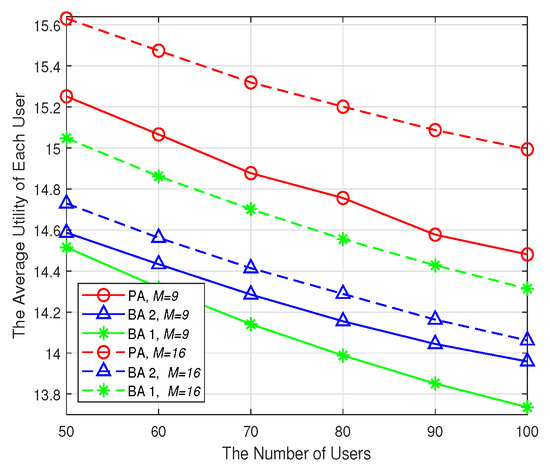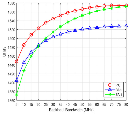 The users’ data rates utility is shown in Figure 2. It can be seen that the utilities of all the three algorithms grow with the increase of the backhaul bandwidth. This validates that with low backhaul bandwidth, the backhaul link would be the bottleneck that limit both users’ and network’s performance. With the alleviation of the backhaul bandwidth strain, the potential of the network performance could be utilized more sufficiently, and users’ performance can be improved. Besides, the performance of the PA is larger than any one of the baseline algorithms, which verifies PA’s great advantage over the existing algorithms. Furthermore, the performance of BA 2 is better than that of the BA 1 when the backhaul bandwidth is below 20 MHz, but becomes lower than that of the BA 1 when the backhaul bandwidth is larger. This verifies that the BA 1 is more suitable to cope with the backhaul-constrained scenarios.