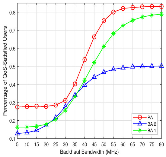 The performance in terms of the percentage of QoS-satisfied users is shown in Figure 3. Similarly to users’ data rates utility, the percentage of QoS satisfied users improves with the increase of the backhaul bandwidth for all the three algorithms. Moreover, it is obvious that the PA has the better performance all the time, compared with the BA 1 and BA 2. However, in contrast with the users’ data rates utility, the percentage of QoS-satisfied users of PA increases very slowly when the backhaul bandwidth is smaller than 25 Mbps. This is because PA tends to achieve a proportional-fair user association and resources allocation solution, and the data rates of most of the users’ would approach the minimum data rates simultaneously. However, if their data rates are not larger than the minimum data rates requirements, this increase would not improve the percentage of QoS-satisfied users. When the backhaul bandwidth is between 30 Mbps to 50 Mbps, the percentage of QoS-satisfied users increases sharply. This means that a large number of users exceed the minimum data rates requirements, with the continuous improvement of backhaul bandwidth. When the backhaul bandwidth is larger than 55 Mbps, the percentage of QoS-satisfied users returns to a slow increase. This is consistent with the trend of data rates utility shown in Figure 2. The stalled increase means that the backhaul bandwidth is large enough and the backhaul link is not the bottleneck of the content delivery any more.