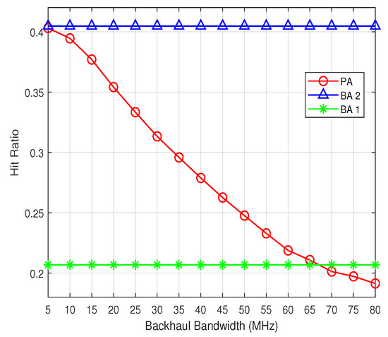 The hit ratio performance of the three algorithms is shown in Figure 4. It can be seen that the hit ratio of both BA 1 and BA 2 does not change when the backhaul bandwidth increases. This is because the user association and content placement of the baseline algorithms have no dependency on the backhaul bandwidth constraint. As a result, the corresponding hit ratio of the BA 1 and BA 2 is not impacted by the backhaul bandwidth. In contrast with the intuition, the Figure 4 shows that the hit ratio of PA decreases when the backhaul bandwidth becomes larger. This is due to the fact that the user association and resources allocation of PA is backhaul bandwidth-aware. When the backhaul bandwidth is not large enough, the backhaul link would be the bottleneck limiting users’ performance. Without sufficient backhaul bandwidth, the users tend to be associated with the SBSs which are not close to them but have cached the requested contents to reduce the backhaul traffic. This would lead to good performance of hit ratio, but the users’ data rates utility would not be improved significantly. However, with the increase of the backhaul bandwidth, the backhaul link can deliver more traffic and the dependency of content delivery on SBSs’ cache is reduced. This means that the users would be associated with neighboring SBSs but can still get good data rates utility. Consequently, with the growth of the backhaul bandwidth, the hit ratio would decline but the data rates utility would increase. Based on this, it can be deduced that the PA has the flexibility of making full use of the (1) communication resources of both the wireless and backhaul links, and (2) the storage resources of SBSs’ cache, to improve the users’ performance.