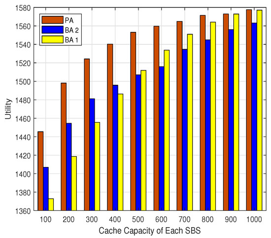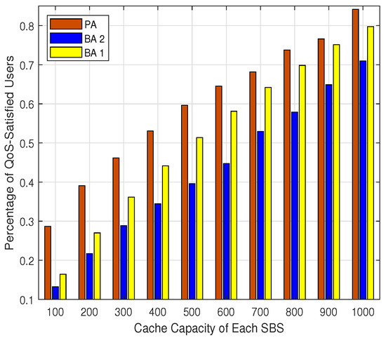 The users’ data rates utility, the percentage of QoS satisfied users, and the hit ratio for different cache capacity are shown in Figure 5, Figure 6 and Figure 7, respectively. It can be seen that the users’ data rates utilities, the percentage of QoS-satisfied users, and the hit ratio for all the three algorithms increase with the expand of the cache capacity. This is consistent with the intuition that with larger cache capacity, more contents can be cached by each SBS, and the probability of cache hit would be improved. This is critical for the backhaul-constrained UDN scenarios, which would relieve the backhaul burden and improve users’ data rates. Additionally, it can be seen that the PA outperforms the BA 1 and BA 2 in terms of users’ data rate utility and the percentage of QoS satisfied users all the time, which shows the advantage of the PA over the existing algorithms.