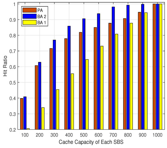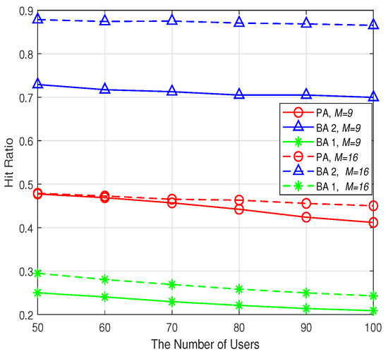 The hit ratio performance for different number of users and SBSs is shown in Figure 10. It can be seen that for all the three algorithms, the hit ratio performance decreases slightly with the increase of the number of users. This is because that the cache capacity of each SBS is fixed and limited but the users’ preferences are diverse. It would be more difficult to utilize the limited cache capacity to store the proper contents when the users number becomes larger. Consequently, the hit ratio performance would deteriorate. Furthermore, note that when the number of SBSs increases from 9 to 16, the corresponding hit ratio performance of all the three algorithms increases. This is intuitive because more SBSs would lead to more storage resources for the network. Hence, there would be higher probability for each user to be served by SBSs’ cache. Besides, note that the BA 2 achieves the highest hit ratio among all the algorithms, no matter how many users and SBSs there are. But combined with the Figure 8 and Figure 9, it can be derived that the highest hit ratio performance of BA 2 is at the cost of each user’s data rates degradation.
