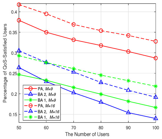 The average utility of user’s data rates and the percentage of QoS-satisfied users are shown in Figure 8 and Figure 9, respectively. It is obvious that with the increase of users’ number, both the metrics decrease for all the algorithms no matter how many SBSs there are. This is intuitive because with limited cache capacity and backhaul bandwidth, the more users, the less backhaul and wireless bandwidth could be shared by each user. As a result, the average user’s date rates, as well as the percentage of QoS-satisfied users would be smaller. Besides, when the number of SBSs is increased from 9 to 16, the average utility of each user and the percentage of QoS-satisfied users are also improved. This is because when there are more SBSs, the available cache storage resources, as well as the wireless and backhaul bandwidth would increase. As a result, the users can benefit from this and the average data rates would be improved. Moreover, Figure 8 and Figure 9 show that the PA achieves the best performance in terms of both average utility and the percentage QoS-satisfied users no matter there are 9 SBSs or 16 SBSs in the network. This reveals the advantage of the PA in utilizing the limited cache storage and communication resources to improve each user’s utility.