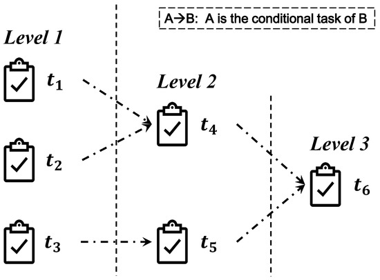 According to Algorithm 1, the level of each task in the task set is gotten. Apparently, tasks are divided into three levels. are in the first level, are in the second level and is in the last level.