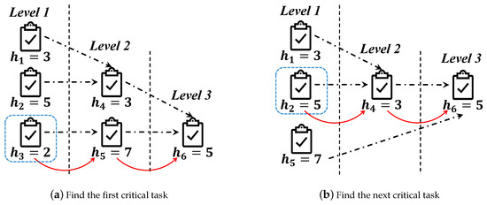Based on the information of tasks in Figure 2, the allocation priority sequence is gotten by continuously finding a new critical task sequence for a changed task set . Figure 3a is the situation of task set when the first task in allocation priority sequence has been found, and Figure 3b corresponds to the second task in the sequence. In Figure 3a, the task sequence is the critical task sequence, then, the task is the first task in allocation priority sequence. In Figure 3b, the task sequence is the critical task sequence in the changed task set , and the task is the second task in the allocation priority sequence. Furthermore, in order to find the third task in the allocation priority sequence, the mechanism ought to find the critical task sequence in the changed task set .