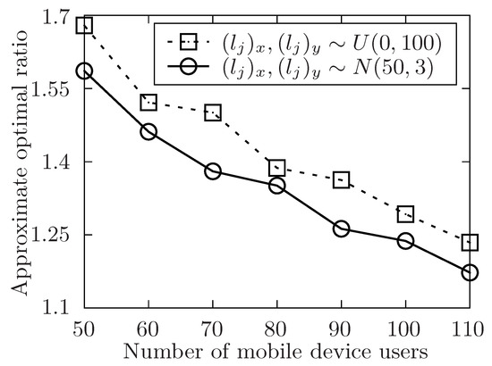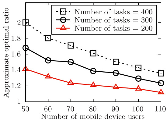 In Figure 4, Figure 6, Figure 8 and Figure 10, the performance of the proposed algorithm is validated by changing the number of released tasks in different parameter settings. Regardless of other parameters’ settings, it is obvious that when the number of involved users increases, the approximate optimal ratio decreases. As the theoretically optimal value of the allocation for the task set is only in connection with the structure of the task set , and the theoretically optimal value is fixed no matter how involved users change. When the number of involved users increases, the time of task’s waiting to be allocated is likely to decrease, which would make the execution time of the task set decrease. Then, the approximate optimal ratio decreases. Therefore, the approximate optimal ratio decreases as the number of involved users increases.