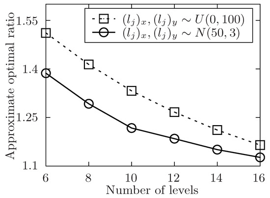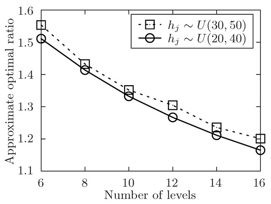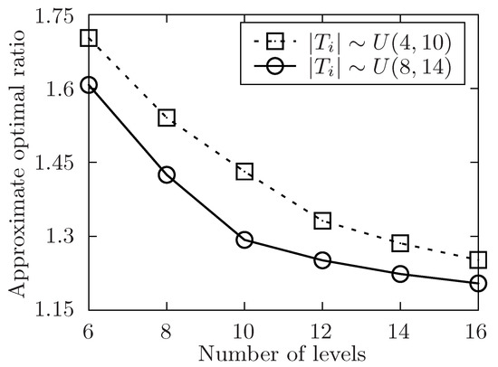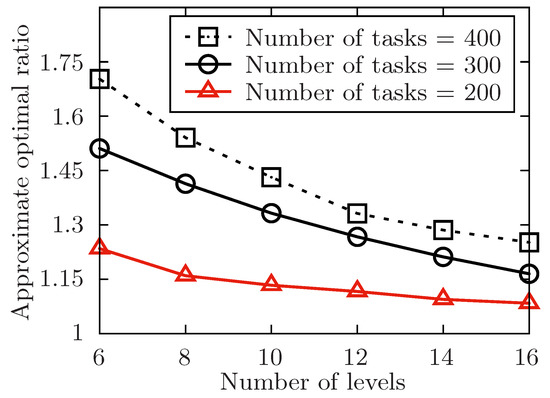 In Figure 4 and Figure 5, the performance of the algorithm is illustrated by changing the number of released tasks. In both two settings, the number of released tasks m ranges in . In Figure 4, it changes the value of involved users n from 50 to 110 while the level of task set l is set to be 6. And in Figure 5, it changes the level of the task set l from 6 to 16 while the number of involved users n is set to be 70. Both two simulations show that the approximate optimal ratio increases with the increasing number of released tasks. As the theoretically optimal value of the allocation for the task set is only in connection with the structure of the task set , and the theoretically optimal value is fixed no matter how the number of released tasks changes. When the number of released tasks increases, the time of each task waiting to be allocated is likely to increase, and the execution time of the released task set is also to increase, which would increase the execution time of the task set .