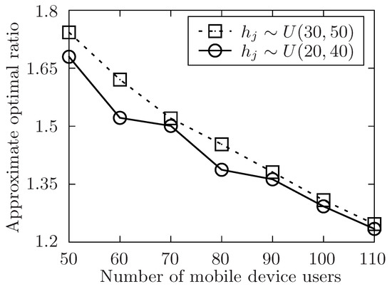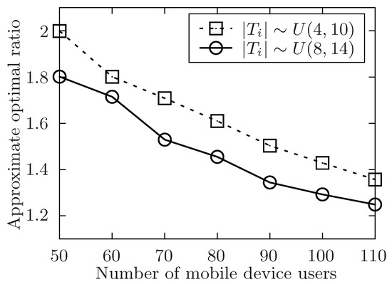 In Figure 6 and Figure 7, the size of involved users’ interested task set is in different range. In these two simulations, the performance of the algorithm is validated by changing the size of user’s submitted task set. Furthermore, the size of user’s submitted task set is uniformly distributed in or . In both two settings, the number of released task m is fixed in 400. In Figure 6, the number of involved users n is changed from 50 to 110 while the level of task set l is set to be 6. And in Figure 5, it changes the level of task set l from 6 to 16 while the number of involved users n is set to be 70. Both two simulations show that the approximate optimal ratio decreases with the increasing number of user’s submitted tasks. As the theoretically optimal value is fixed no matter how the number of released tasks changes. When the number of submitted tasks increases, and there exists some users in the available user list, the time of each task’s waiting to be allocated is more likely to decrease, and the execution time of the released task set is also to decrease, which would make the execution time of the task set decrease.