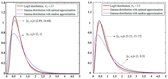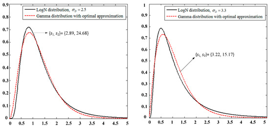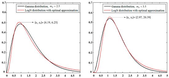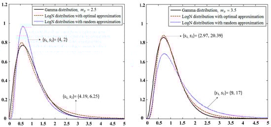 For the sake of clarity, Figure 3 presents the PDF curve comparison of the Gamma distribution in the first time slot with the approximated LogN distribution under normalized conditions (E() = 1) for different combinations of the parameters s1, s2,and mR.