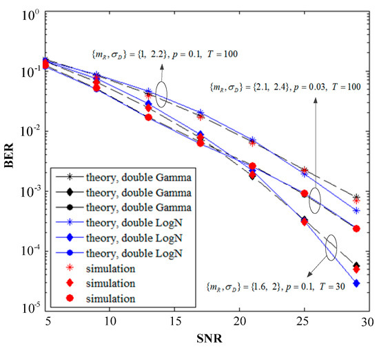 Figure 6 shows the BER performance of the simulated and theoretical calculations when the fading parameters are set to , the values of the Bernoulli-Gaussian noise parameters p and T are shown in the figure. The BER decreases as the system SNR increases, and the resulting curve matches well with the Monte Carlo simulations, thereby implying the correctness of the derived analytical expressions and the validity of the theoretical derivation of the two approximation algorithms. The coincidence degree between the theory and simulation of the L2G algorithm is likewise higher than that of the G2L algorithm in terms of algorithm comparison, especially at high SNR, which is caused by multiple approximations in the theoretical calculation of the latter algorithm. The L2G algorithm is highly accurate and suitable for arbitrary m values rather than special parameters, which are reflected in the BER curves of the three sets of parameters in the figure. However, the simulation process of the L2G algorithm is sensitive to the selection of parameters, and such sensitivity is related to the high complexity of the algorithm and the large proportion of integrals involved. Although the G2L algorithm is not accurate enough, the theoretical calculation is simply for end-to-end SNR and multiple approximations, which can be used to analyze many performance indicators and solve a wide range of problems.