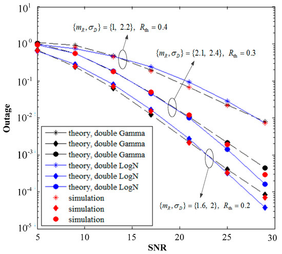 Similarly, the outage probability Pout is defined as the probability value when the instantaneous total SNR is lower than the fixed threshold (Rth). The outage probability can also be calculated by substituting Equation (22) into the following equation [25] after some necessary alterations: