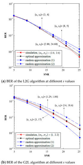 Figure 8 illustrates the performance of BER in the two approximation algorithms with the different approximation accuracies caused by the value of the s vectors. The fading parameters are , and the other parameters are set by default. Figure 8a,b shows that the coincidence between the theoretical algorithms and the simulation of the two approximation theoretical algorithms with the best s values is much higher than that with the random selection of s values. This outcome proves that the selection of the best s values is more conducive to obtaining the fading parameters of the approximate distribution accurately in the approximation process based on the PDF and MGF equations, wherein the system performance can be analyzed more accurately.