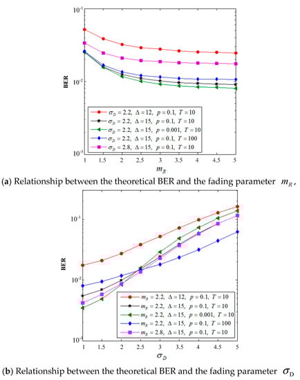 The two graphs in Figure 9 compare the relationship of the system BER with the fading parameters and under different channel parameter settings. We assume here that the fading parameters are 2.2 and 2.8 and that the average SNR Δ values are 12 and 15 dB, respectively. To highlight the contrast, p and T have two additional values of 0.001 and 100 respectively in addition to the initial default values. For the horizontal and vertical analyses of Figure 9, the following conclusions can be drawn: (1) Figure 9a shows that the system BER decreases as the increases (the wireless link fading is reduced), while the other parameters remain unchanged. When is larger than 2.5, the BER curve gradually flattens and the influence on the BER performance decreases. Similarly, Figure 9b shows that the BER performance of the system increases with the increase of (serious power line link fading) under the condition that other parameters are constant, and the change trend of the BER curve is more significant than that of Figure 9a. Therefore, we conclude that the BER performance of the system is more sensitive to the selection of than that of . Therefore, for the dual-hop hybrid fading system, the LogN link occupies the dominant link, and the system performance can be optimized by significantly adjusting the environment variables of the link. (2) Figure 9a,b shows that the change of the channel noise parameters has a small impact on the BER. For example, when other parameters remain unchanged, the system performance improves slightly after p changes from 0.1 to 0.001, and the BER changes slightly after T changes from 10 to 100. (3) When the fading parameters p and T are the same, the BER performance of the system will significantly improve by increasing Δ, as reflected in both graphs. However, the improvement of the system will be different by increasing the same Δ under different fading parameters.