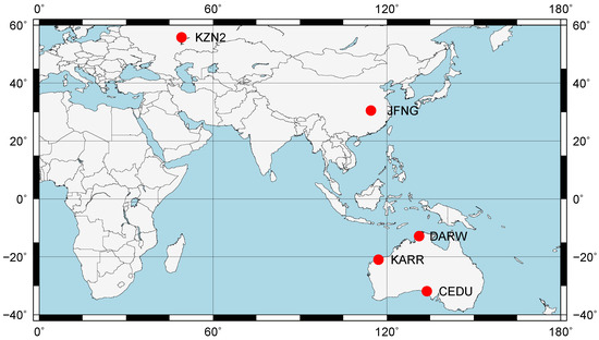 There are 146 globally distributed reference stations at MGEX, of which 39 stations have the coordinates in the file gbm19962.clk. From the 39 globally distributed reference stations, we chose five stations (CEDU, DARW, JFNG, KARR, KZN2) which are shown in Figure 1. These stations are mostly concentrated in the Asia-Pacific region where the number of satellites with triple-frequency data is sufficient.