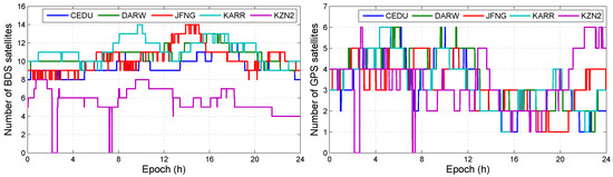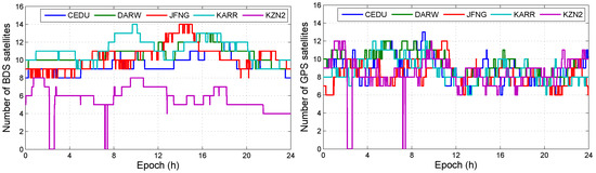 Not all BDS/GPS satellites have third frequency signals. The number of BDS/GPS satellites with dual-frequency data is not equal to the number of BDS/GPS satellites with triple-frequency data. We illustrate the number of BDS or GPS satellites with dual-frequency or triple-frequency in DOY 100, 2018, which are shown in Figure 2 and Figure 3, respectively.